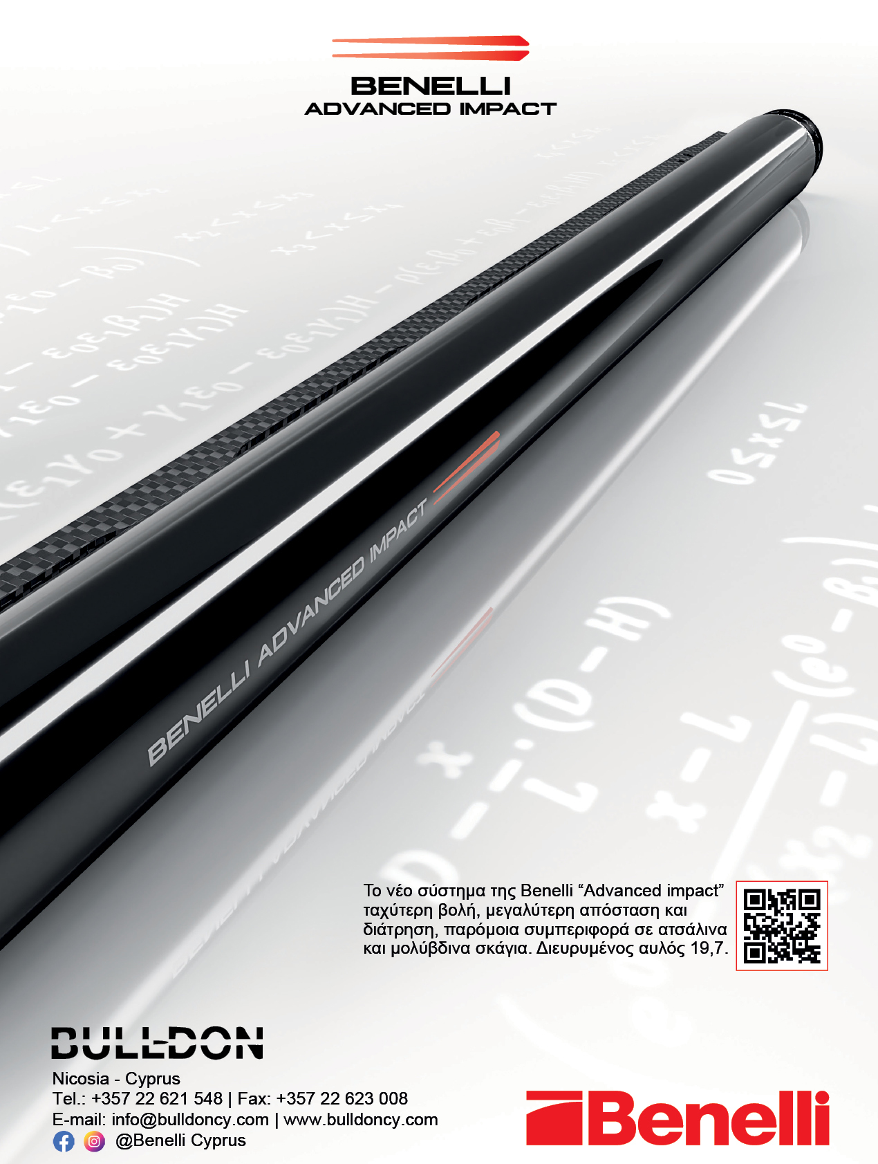 Το νέο σύστημα της Benelli "Advanced impact" ταχύτερη βολή, μεγαλύτερη απόσταση και διατήρηση, παρόμοια συμπεριφορά σε ατσάλινα και μολύβδινα σκάγια. Διευριμένος αυλός 19,7.
