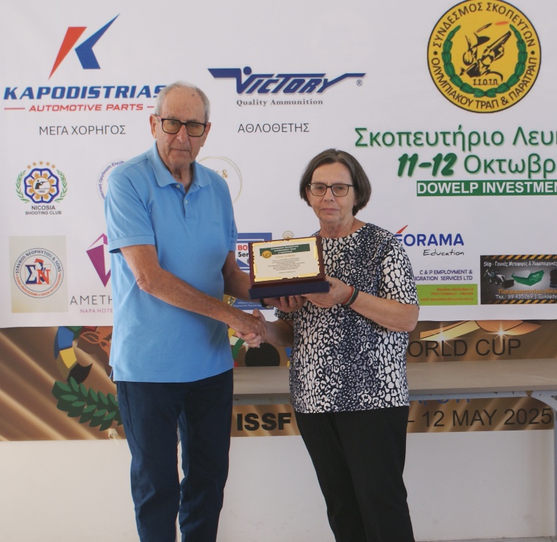 Στη διάρκεια της απονομής των επάθλων στους νικητές, ο Σύνδεσμος απένειμε τιμητική πλακέτα στην τιμώμενη Ελευθερία Στεργίδου, ως ένδειξη ελάχιστης εκτίμησης για την τεράστια προσφορά της στο άθλημα και τους αθλητές της σκοποβολής για 37 χρόνια. Η Ελευθερία, υπήρξε η πρώτη έμμισθη υπάλληλος της ΣΚΟΚ, από τον Αύγουστο του 1988 μέχρι τον Αύγουστο του 2025! Υπηρέτησε το άθλημα, το Δ.Σ της Ομοσπονδίας και τους αθλητές με συνέπεια και αγάπη, ενώ ευτύχησε να ζήσει τις μεγάλες επιτυχίες των σκοπευτών και σκοπευτριών, καθώς και τα μεγάλα άλματα της σκοποβολής από τα επαρχιακά σκοπευτήρια του ενός γηπέδου τραπ κι ενός γηπέδου σκητ, στα διεθνή και ολυμπιακά σκοπευτήρια των έξι και 8 γηπέδων, τα οποία φιλοξένησαν όλες τις κορυφαίες διοργανώσεις των Διεθνών Ομοσπονδιών UIT (ISSF) και FITASC και της Ευρωπαϊκής ESC, καθώς και δυο Αγώνες Μικρών Κρατών Ευρώπης (1989 και 2009) . Η Ελευθερία υπηρέτησε με ζήλο πέντε προέδρους της Ομοσπονδίας, 6 γενικούς γραμματείς και 13 διοικητικά συμβούλια. Συγκεκριμένα, προσελήφθη το 1988 επί προεδρίας του αείμνηστου Λάκη Ψημολοφίτη (1985 – 1990 και 1993 – 2005), συνέχισε με πρόεδρο μ. Γεώργιο Χατζηπέτρου (1990 – 1993), τον Δημήτρη Λόρδο (2005 – 2021), τον Τζιοβάνη Σαββίδη (2021 -2023) και μέχρι την αφυπηρέτηση της με τον Λένο Κυριάκου. Τιμητική πλακέτα ο Σύνδεσμος απένειμε και στον πρώην πρόεδρο της ΣΚΟΚ Δημήτρη Λόρδο για την πολύχρονη προσφορά του προς το άθλημα της σκοποβολής ως αθλητής και ως αξιωματούχος.