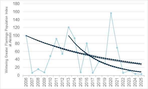 Οι μηνιαίες καταμετρήσεις υδρόβιων πουλιών που διεξάγονται συστηματικά από την Υπηρεσία Θήρας και Πανίδας και το BirdLife Cyprus για πάνω από δύο δεκαετίες, δείχνουν μείωση του πληθυσμού του είδους στην Κύπρο. Συγκεκριμένα, από το 2013 μέχρι και σήμερα παρατηρείται μια πτώση της τάξης του 14 – 31% (Γράφημα 1). Σύνοψη της κατάστασης του είδους στη Κύπρο παρουσιάστηκε πρόσφατα στο 4ο Διεθνές Συμπόσιο για τα Φλαμίνγκο που έλαβε χώρα στην Ιταλία, 10-15 Νοεμβρίου 2025.