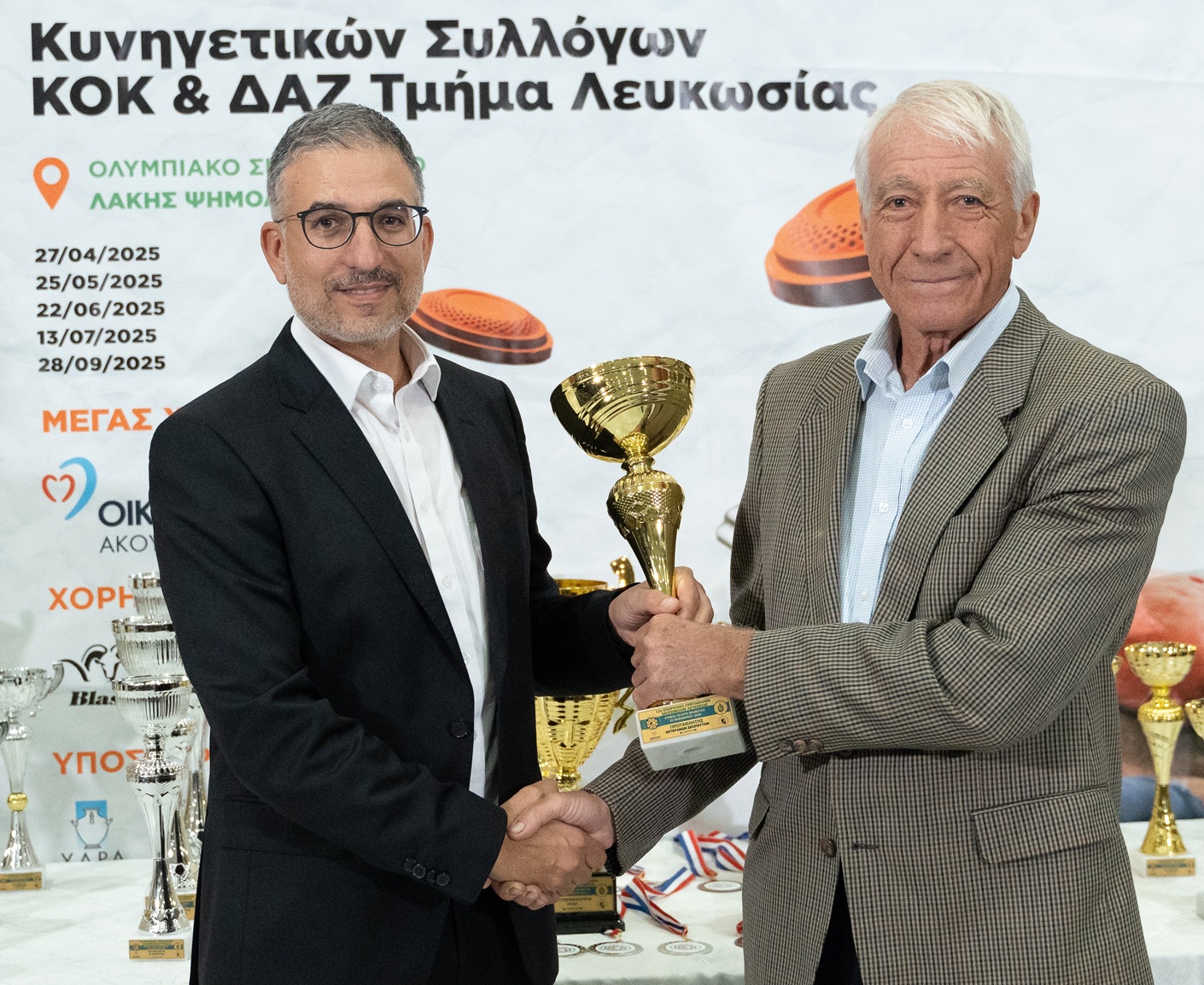 5. Ο πρωταθλητής των βετεράνων κυνηγών Ηλίας Χαραλάμπους, παραλαμβάνει το έπαθλο του από τον πρόεδρο της ΚΟΚ & ΔΑΖ Ηλία Πεκρή.