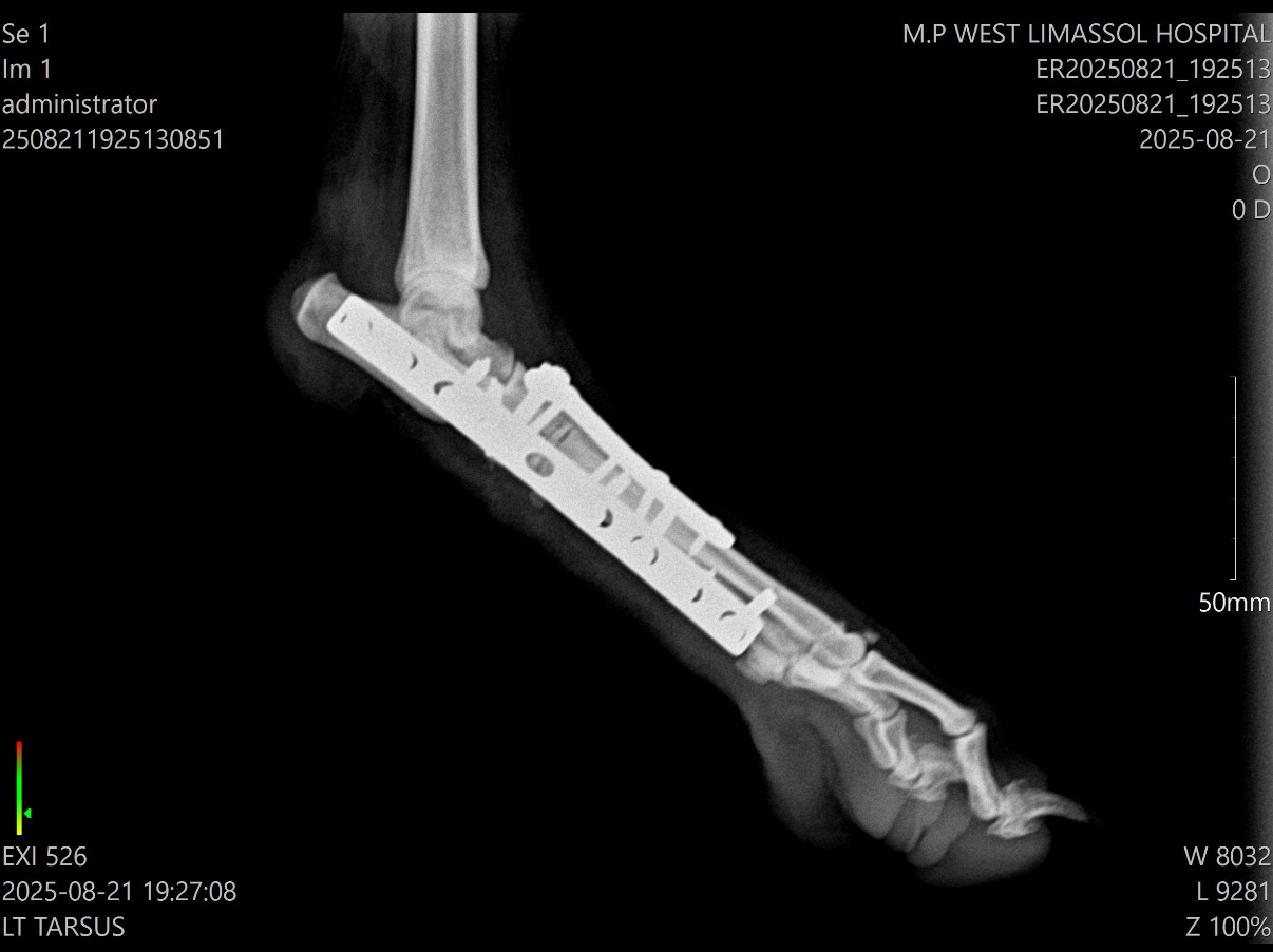 Στους επανελέγχους, ο σκύλος έφερε προοδευτικά βάρος στο χειρουργημένο άκρο, με εμφανή βελτίωση της σταθερότητας και της άνεσης. Η πώρωση των αρθροδεδεμένων διαρθρώσεων επιβεβαιώθηκε ακτινολογικά. Η διατήρηση της ταρσοκνημικής λειτουργίας συνέβαλε στη σχεδόν φυσιολογική μηχανική βάδισης. Ο ασθενής αναμένεται να επιστρέψει πλήρως στη δραστηριότητα κυνηγιού κατά την επόμενη περίοδο.